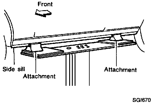 ^ The board-on lift attachment (LM4086-0200) set at front end of vehicle should be set on the front of the sill under the front door opening.