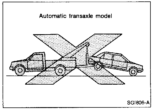CAUTION: Never tow an automatic transaxle model with rear wheels raised (with front wheels on ground). This may cause serious and expensive damage to the transaxle. If it is necessary to tow it with rear wheels raised, always use a towing dolly under the front wheels.