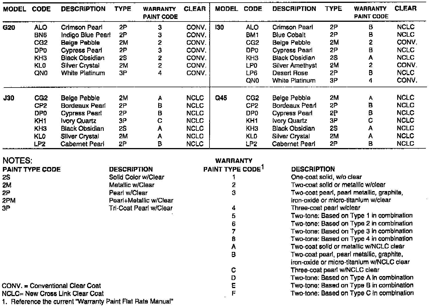The following charts identify 1996 Infiniti paint codes, New Cross Link Clear Coat (NCLC) usage, color names and refinish paint codes for major automotive paint manufacturers. For approved NCLC clear coat products and procedures, refer to Infiniti bulletin ITB950-016.