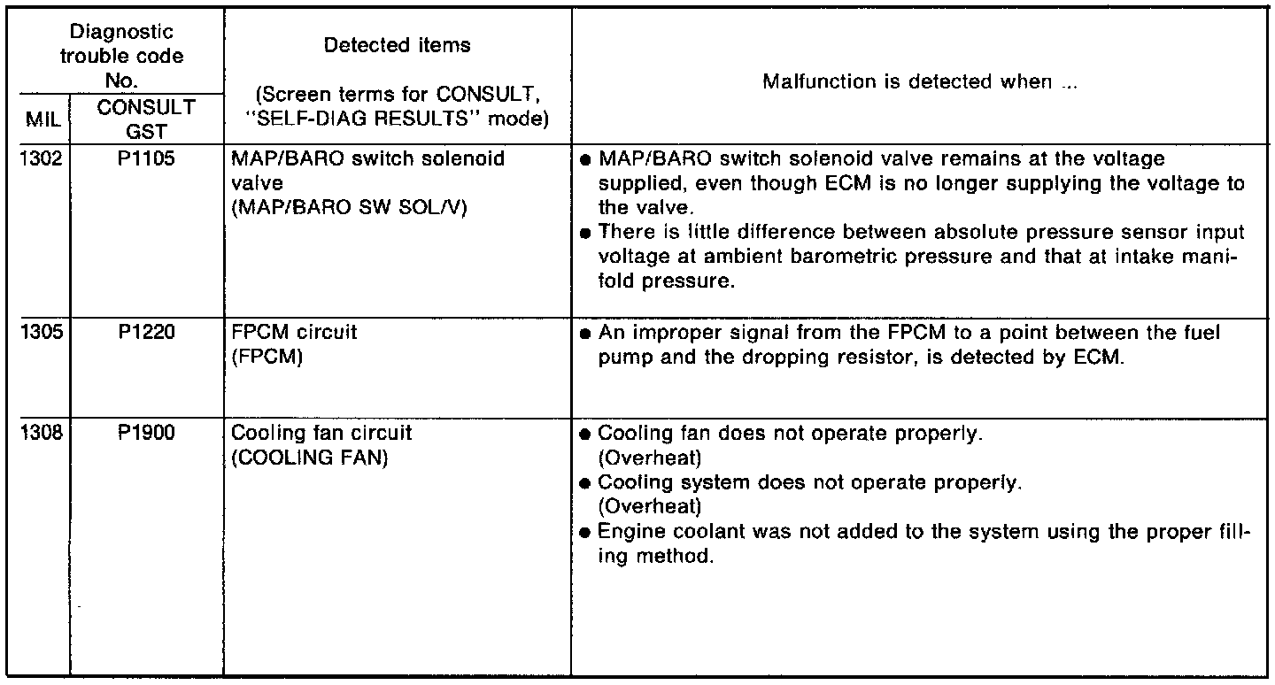 Codes 1302 (P1105) - 1308 (P1900)