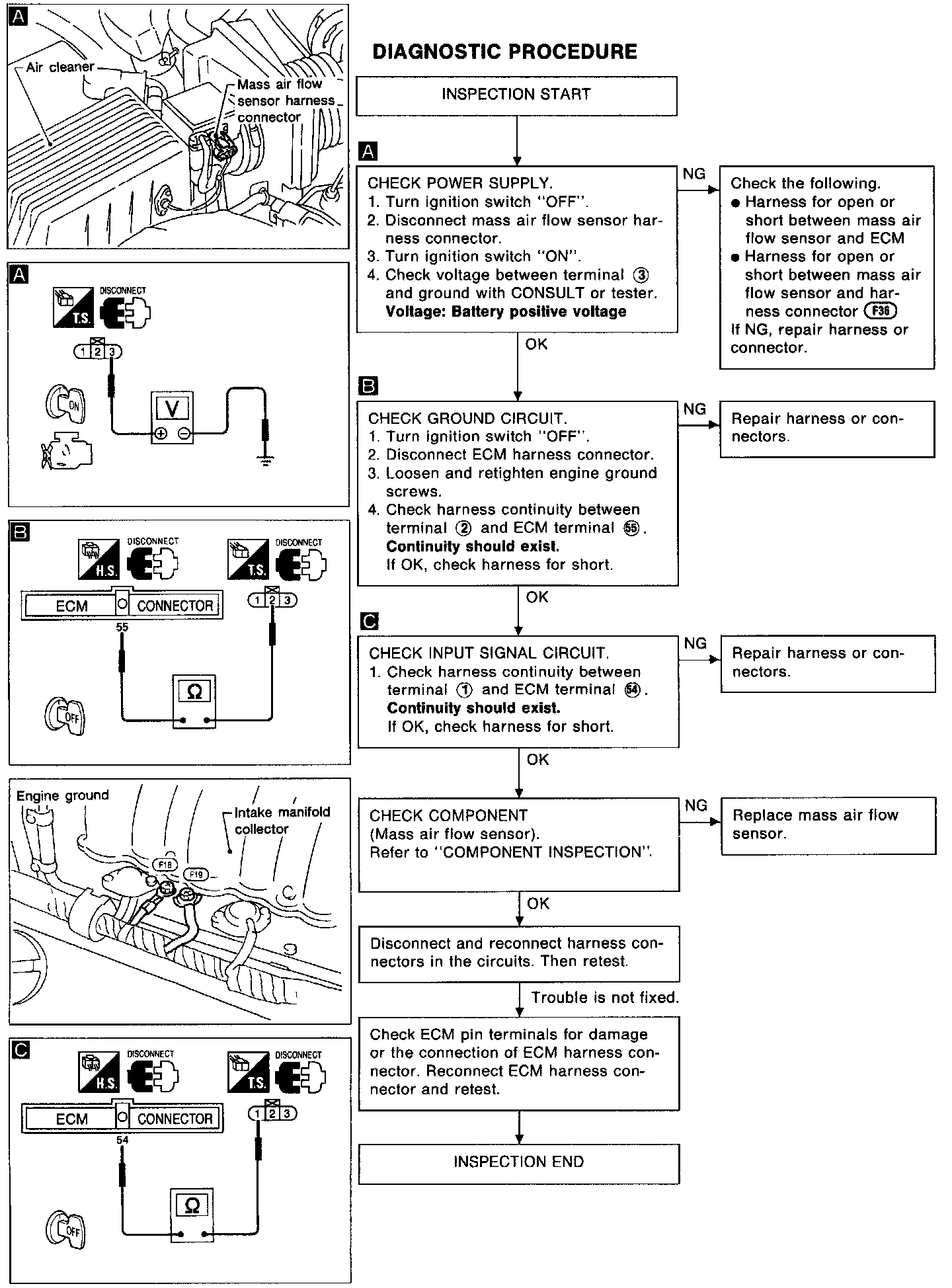 4. If NG, remove mass air flow sensor from air duct. Check hot film for damage or dust.