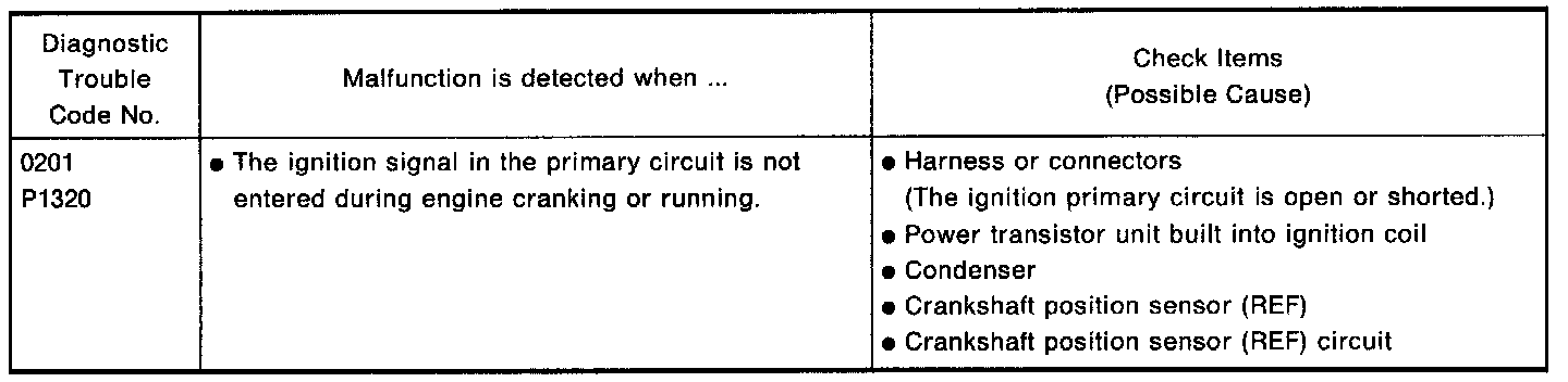 - If both DTC 0201 (P1320) and DTC 0101 (P0340), 0407 (P1335), 0802 (P0335) or 0905 (P1336) are displayed, perform TROUBLE DIAGNOSIS FOR DTC 0101, 0407, 0802 or 0905 first.