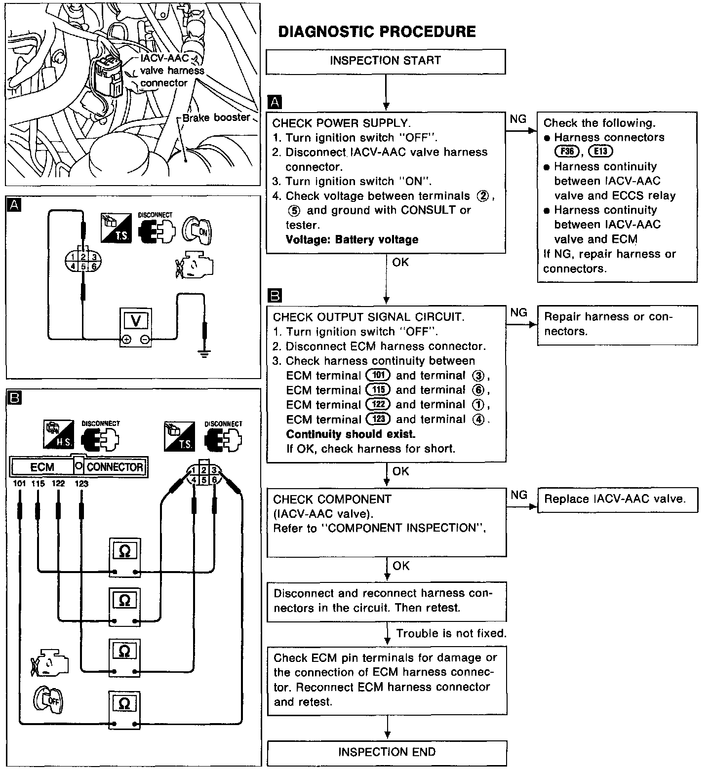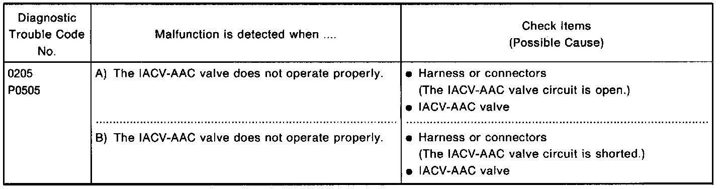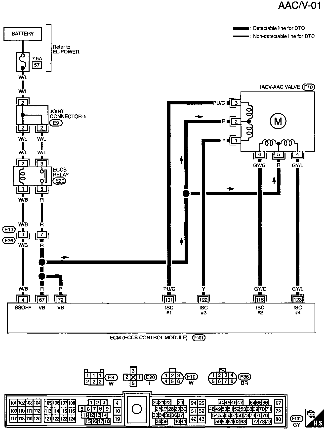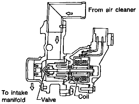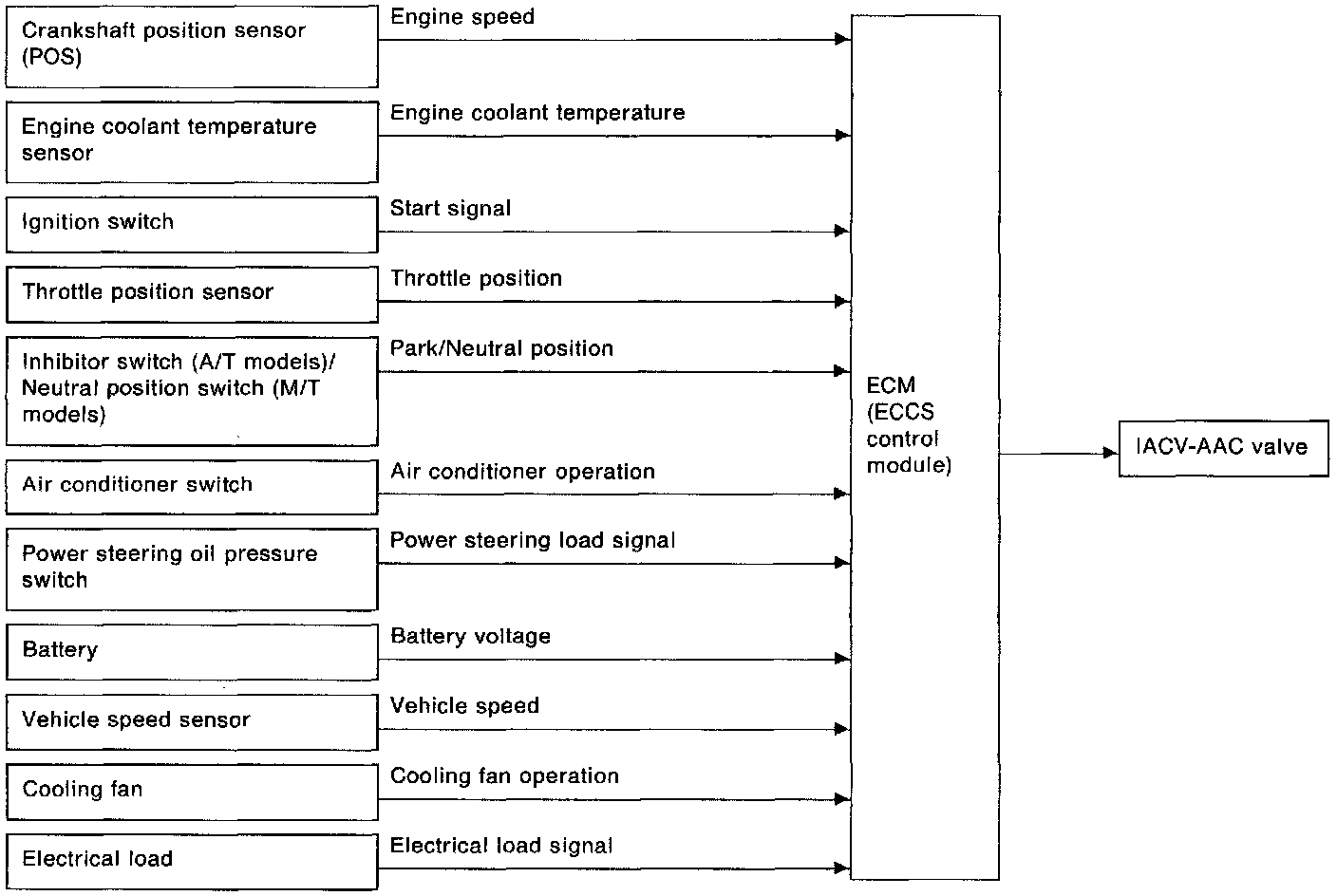 The IACV-AAC valve is operated by a step motor for centralized control of auxiliary air supply. This motor has four winding phases and is actuated by the output signals of ECM which turns ON and OFF two windings each in sequence. Each time the IACV-AAC valve opens or closes to change the auxiliary air quantity, the ECM sends a pulse signal to the step motor. When no change in the auxiliary air quantity is needed, the ECM does not issue the pulse signal. A certain voltage signal is issued so that the valve remains at that particular opening.
