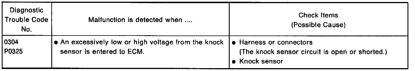 NOTE: Freeze frame data is not stored in the ECM for the knock sensor. The MIL will not light for knock sensor malfunction.The knock sensor is attached to the cylinder block. It senses engine knocking using a piezoelectric element. A knocking vibration from the cylinder block is sensed as vibrational pressure. This pressure is converted into a voltage signal and sent to the ECM.