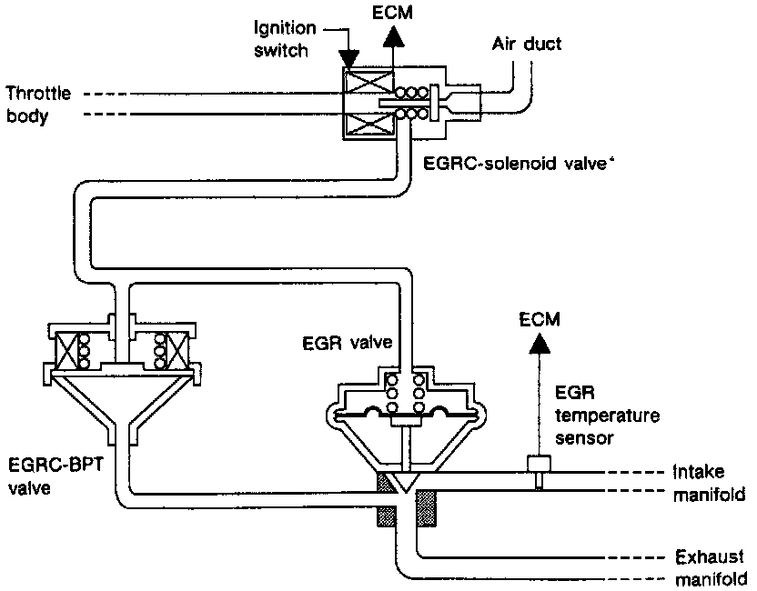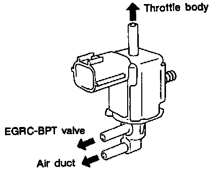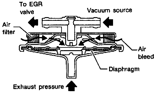 The EGRC-BPT valve monitors exhaust pressure to activate the diaphragm, controlling throttle body vacuum applied to the EGR valve. In other words, recirculated exhaust gas is controlled in response to positioning of the EGR valve or to engine operation.