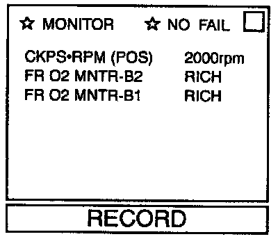 - "FR O2 MNTR-B1(B2)" in "DATA MONITOR" mode changes from "RICH" to "LEAN" to "RICH" 5 times in 10 seconds.