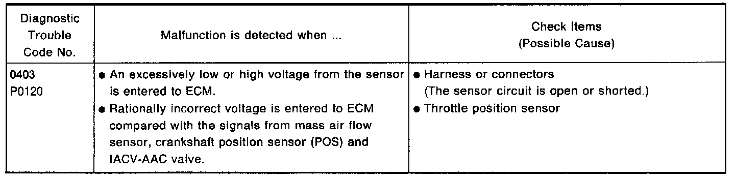 Idle position of the throttle valve is determined by the ECM receiving the signal from the throttle position sensor. This one controls engine operation such as fuel cut. In addition, for models other than non-California M/T models, a "Wide open and closed throttle position switch" is built into the throttle position sensor unit.