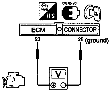4) Check the voltage between ECM terminal (23) and (25) (ground) and make sure the followings: