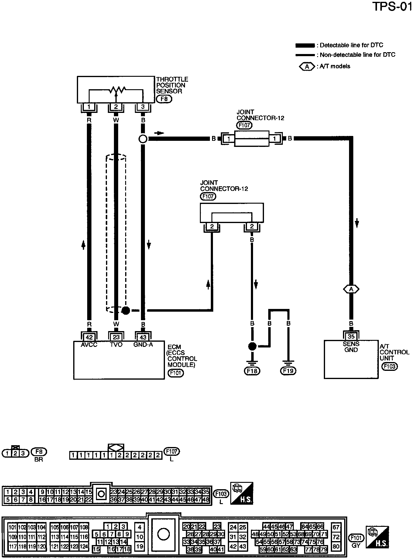 The throttle position sensor responds to the accelerator pedal movement. This sensor is a kind of potentiometer which transforms the throttle position into output voltage, and emits the voltage signal to the ECM. In addition, the sensor detects the opening and closing speed of the throttle valve and feeds the voltage signal to the ECM.
