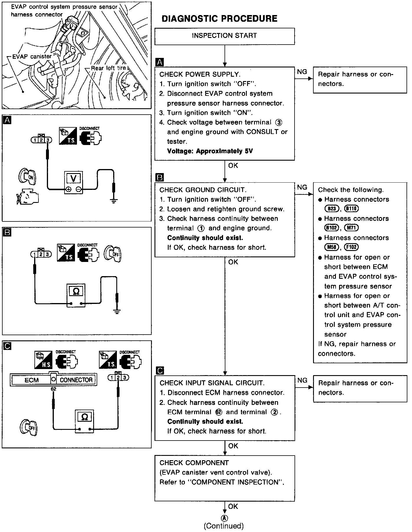1. Remove EVAP control system pressure sensor from bracket with its harness connector connected.