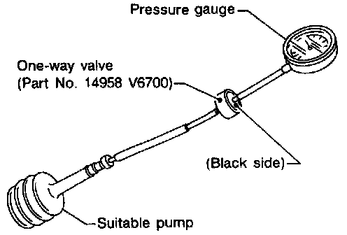 3. Set up one-way valve (Part No. 14958 V6700), pressure gauge and suitable pump as shown at left. Pressurize the system to 13.3 kPa (100 mmHg, 3.94 inHg). Observe the amount of depressurization in kPa (mmHg, inHg) after one minute with the system left unattended.