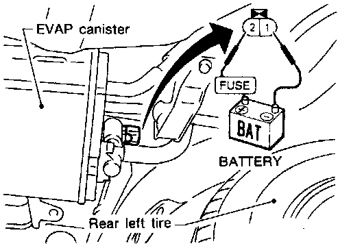 In the event of no pressure rise being observed in the "Pressure test", conduct the alternative leak detection check. This check, on the line between the fuel tank and EVAP canister purge control valve, is accomplished under the "Vacuum test" condition.