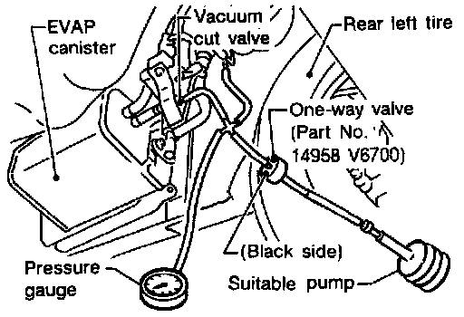 6. Disconnect rubber tube between vacuum cut valve and EVAP shut valve. Set up one-way valve (Part No. 14958 V6700), pressure gauge and suitable pump as shown at left.
