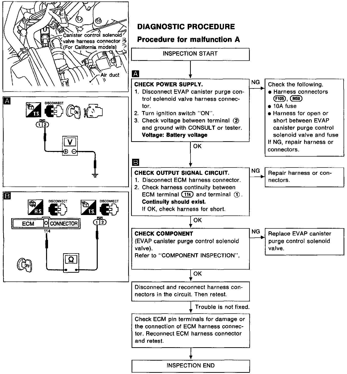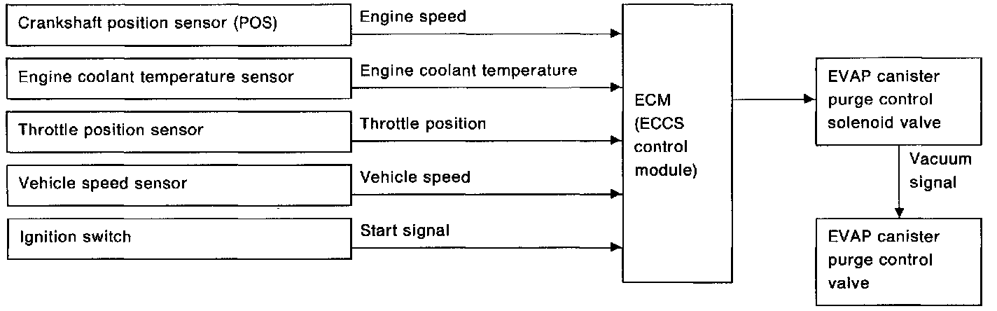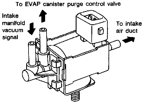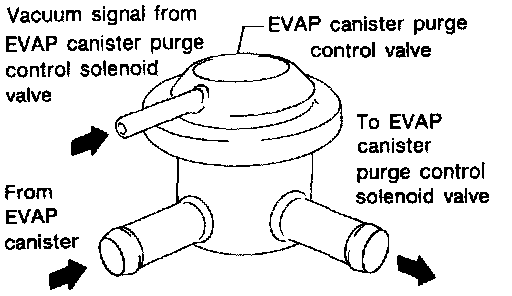 The EVAP canister purge control solenoid valve responds to signals from the ECM. When the ECM sends an OFF signal, the vacuum signal (from the intake manifold to the EVAP canister purge control valve) is cut.