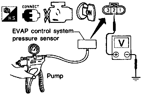 3. Apply vacuum and pressure to EVAP control system pressure sensor with pump as shown in figure.