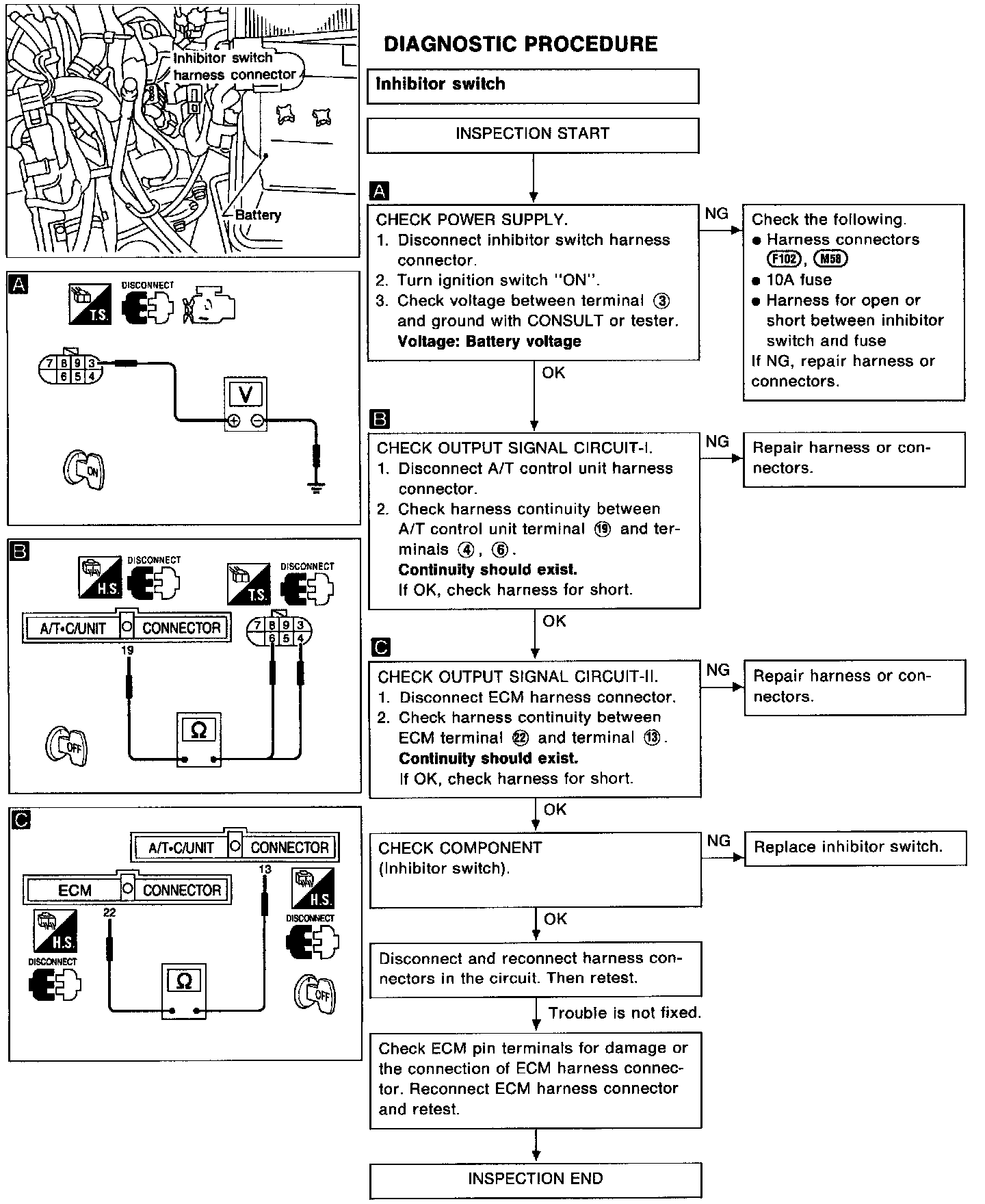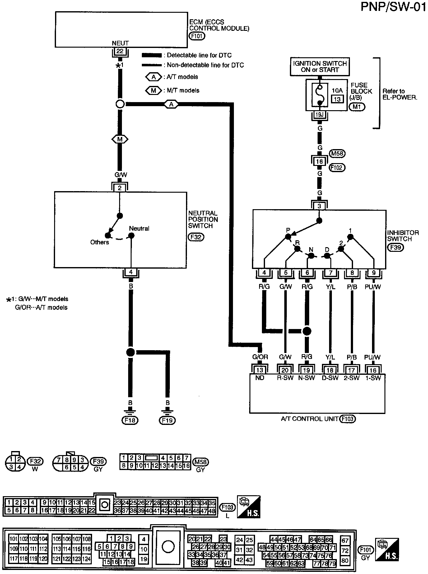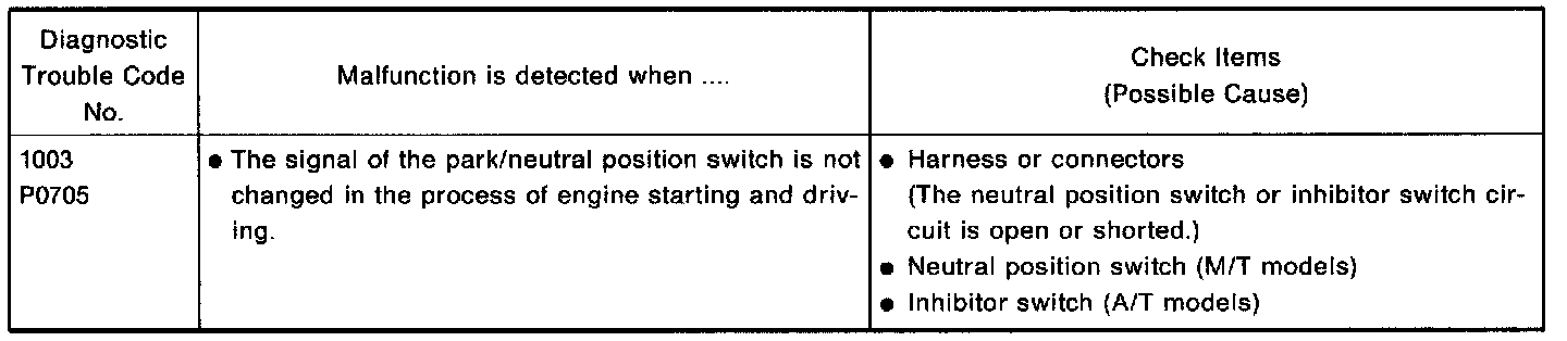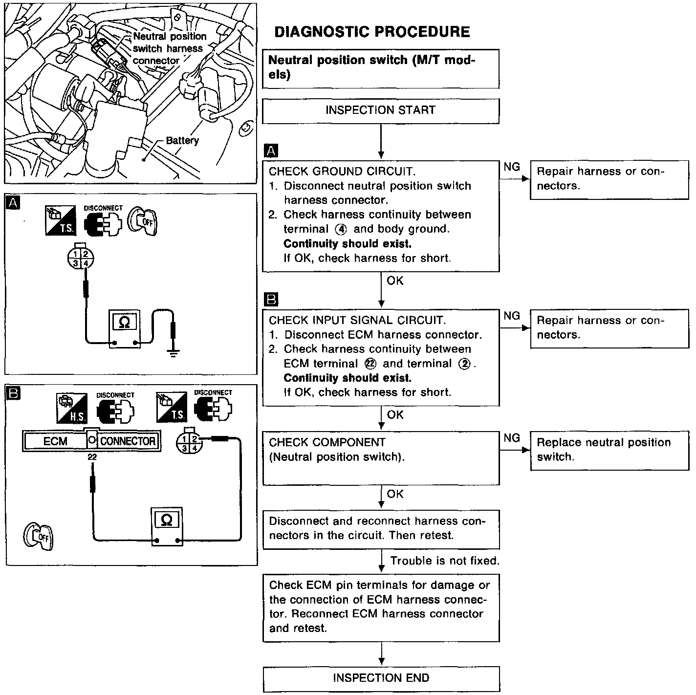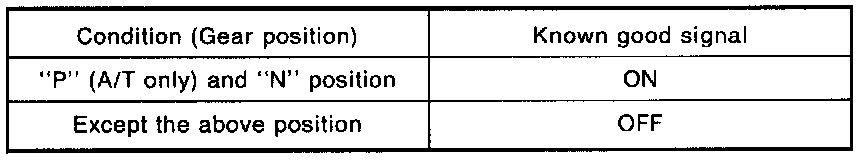 When the gear position is in "P" (A/T models only) or "N", park/neutral position is "ON". ECM detects the position because the continuity of the line (the "ON" signal) exists.DIAGNOSTIC CHART