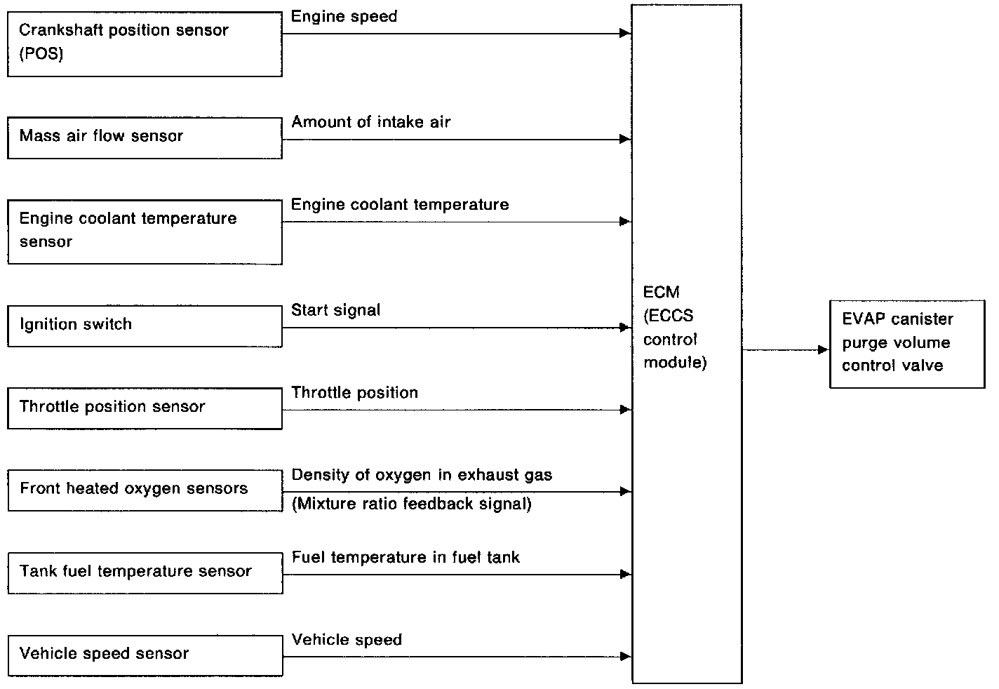 This system automatically controls flow rate of fuel vapor from EVAP canister. The EVAP canister purge volume control valve changes the opening of the vapor by-pass passage to control the flow rate. This valve is actuated by a step motor built into the valve, which moves the valve in the axial direction in steps corresponding to the ECM output pulses, the opening of the valve is varied to allow for optimum engine control. The optimum value stored in the ECM is determined by taking into consideration various engine conditions. When the engine operates, the flow rate is proportionally regulated as the air flow increases.