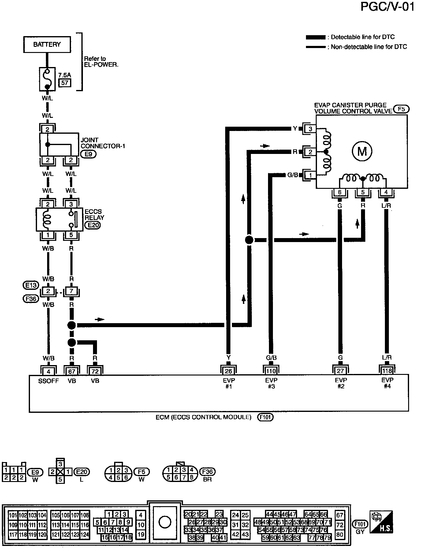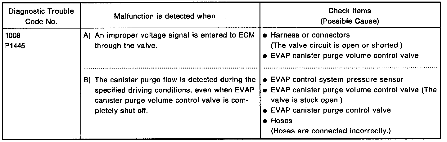 The EVAP canister purge volume control valve is operated by a step motor for control of flow rate of fuel vapor from EVAP canister. This motor has four winding phases and is actuated by the output pulse signal of ECM which turns ON and OFF two windings each in sequence. Each time the valve opens or closes to change the flow rate, an ON pulse is issued. When no change in the flow rate is needed, the valve remains at a certain opening, hence no pulse signal output is issued.