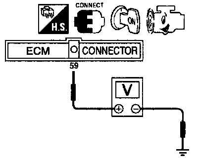 3) Start engine and warm it up until the voltage between ECM terminal (59) and ground drops to 1.2 - 1.9V, then stop engine. (If the voltage drops below the above range, stop engine and wait until the voltage rises to within this range.)