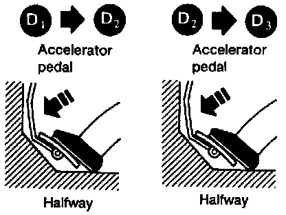 3) Start vehicle with selector lever in D and throttle opening halfway. Check that vehicle runs through gear shift of D1 -> D2 -> D3 -> D4 D4 lock-up, in accordance with shift schedule. Refer to shift schedule.