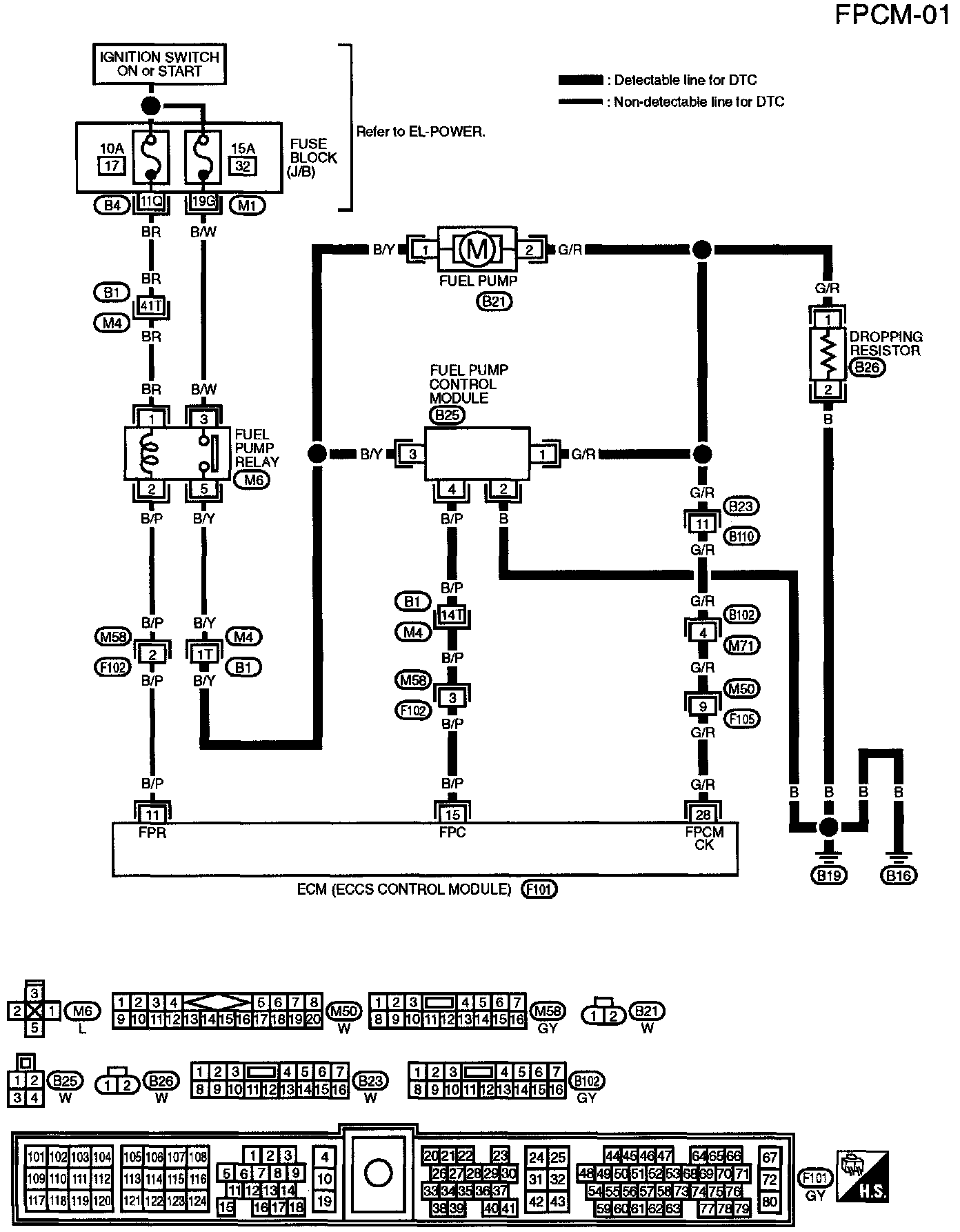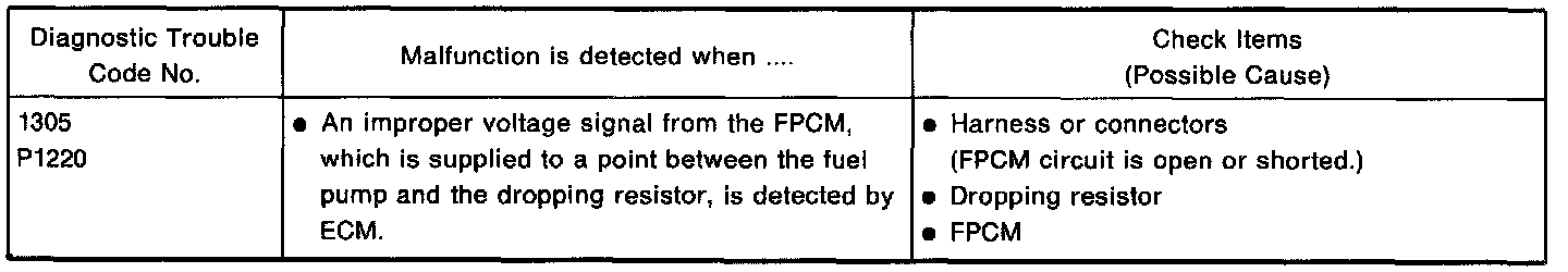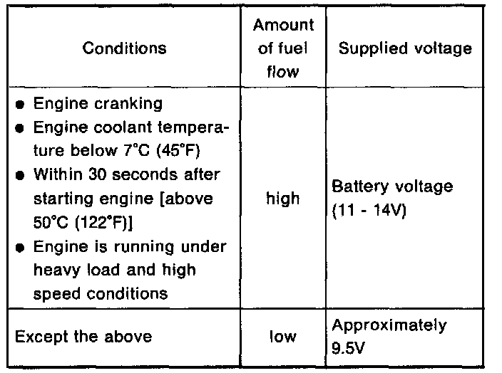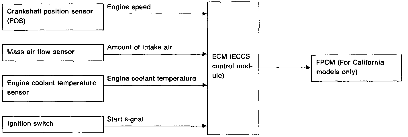This system controls the fuel pump operation. The amount of fuel flow delivered from the fuel pump is altered between two flow rates by the FPCM operation. The FPCM determines the voltage applied to the fuel pump (and therefore fuel flow) according to the following conditions.