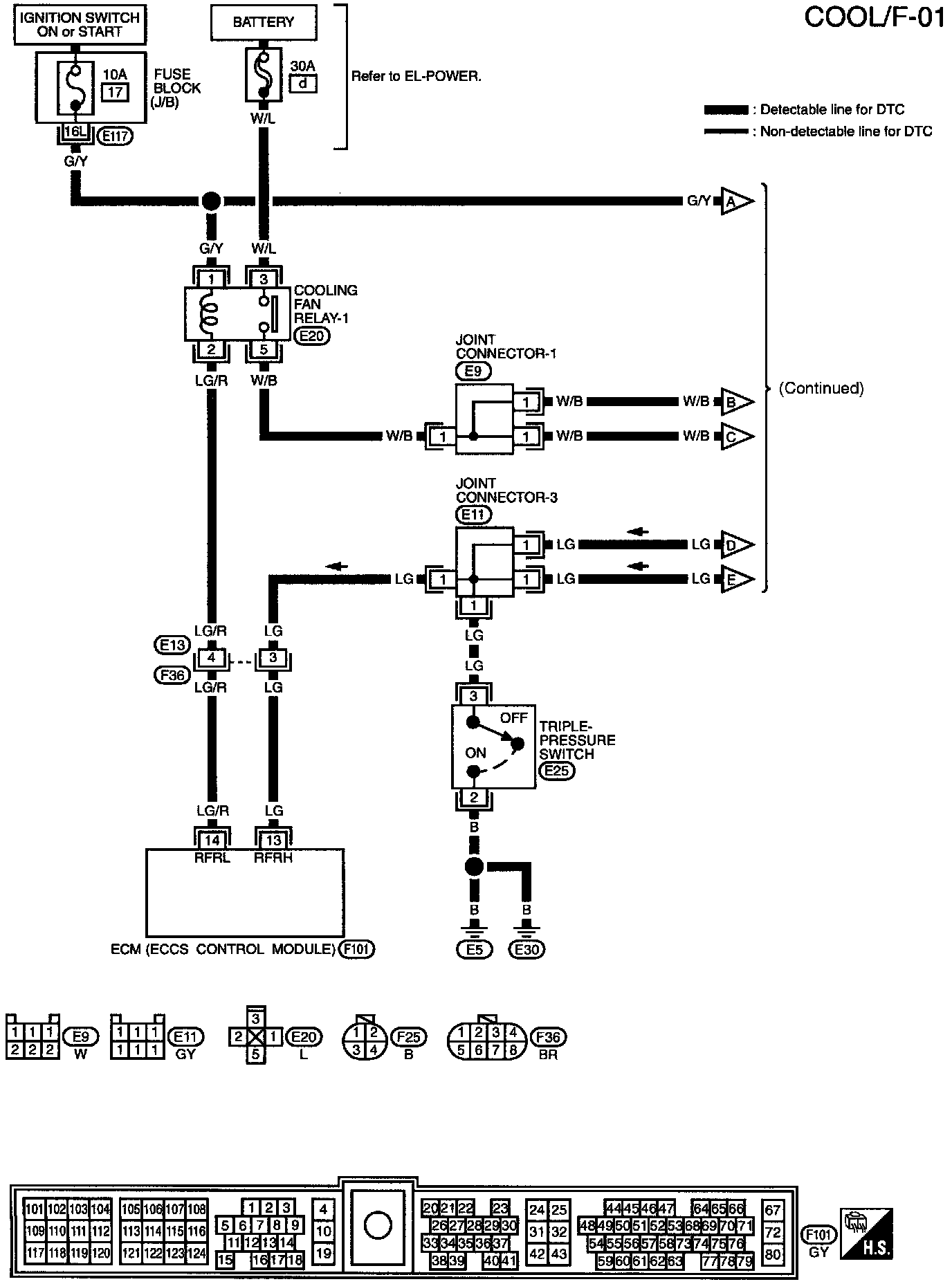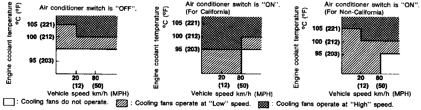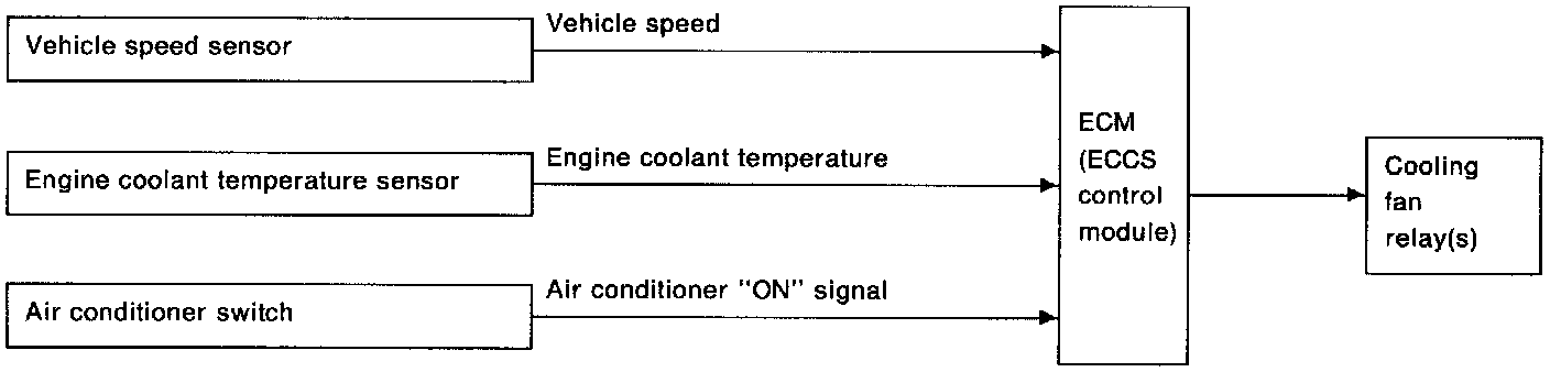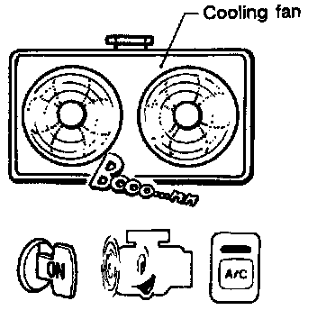 The ECM controls the cooling fan corresponding to the vehicle speed, engine coolant temperature and air conditioner ON signal. The control system has 3-step control (HIGH/LOW/OFF).