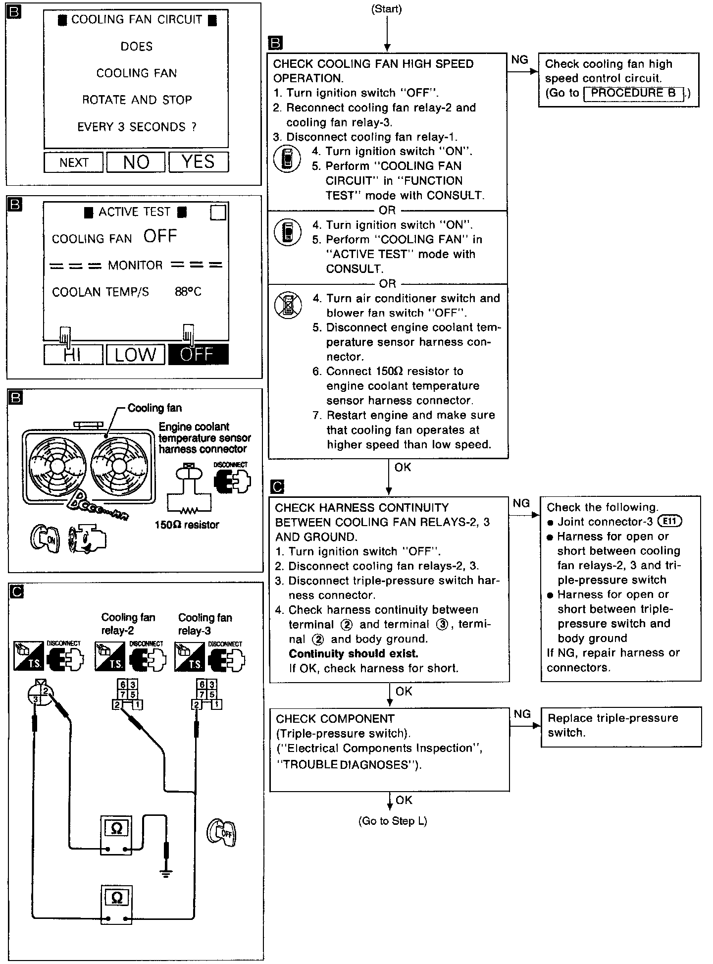 4) Perform "COOLING FAN" in "ACTIVE TEST" mode with CONSULT (LOW speed and HI speed).
