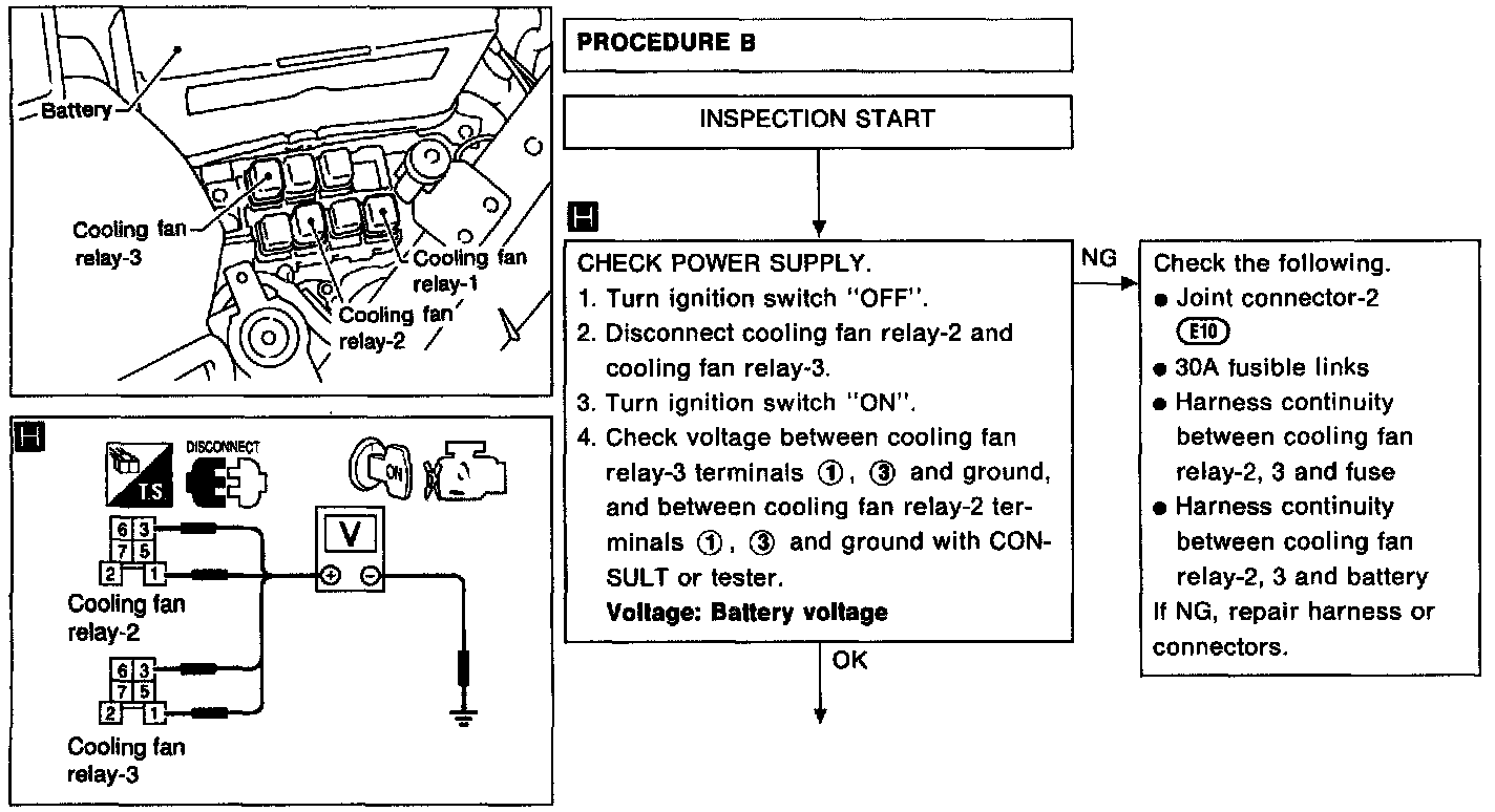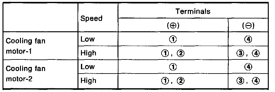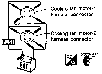 2. Supply cooling fan motor terminals with battery voltage and check operation.