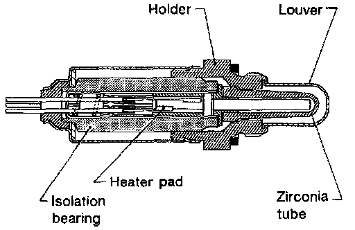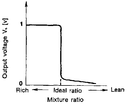 The front heated oxygen sensor (left bank) is placed into the front tube (left bank). It detects the amount of oxygen in the exhaust gas compared to the outside air. The front heated oxygen sensor (left bank) has a closed-end tube made of ceramic zirconia. The zirconia generates voltage from approximately 1V in richer conditions to 0V in leaner conditions. The front heated oxygen sensor (left bank) signal is sent to the ECM. The ECM adjusts the injection pulse duration to achieve the ideal air-fuel ratio. The ideal air-fuel ratio occurs near the radical change from 1V to 0V.