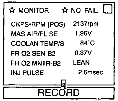 - "FR O2 MNTR-B2" in "DATA MONITOR" mode changes from "RICH" to "LEAN" to "RICH" 5 times in 10 seconds.