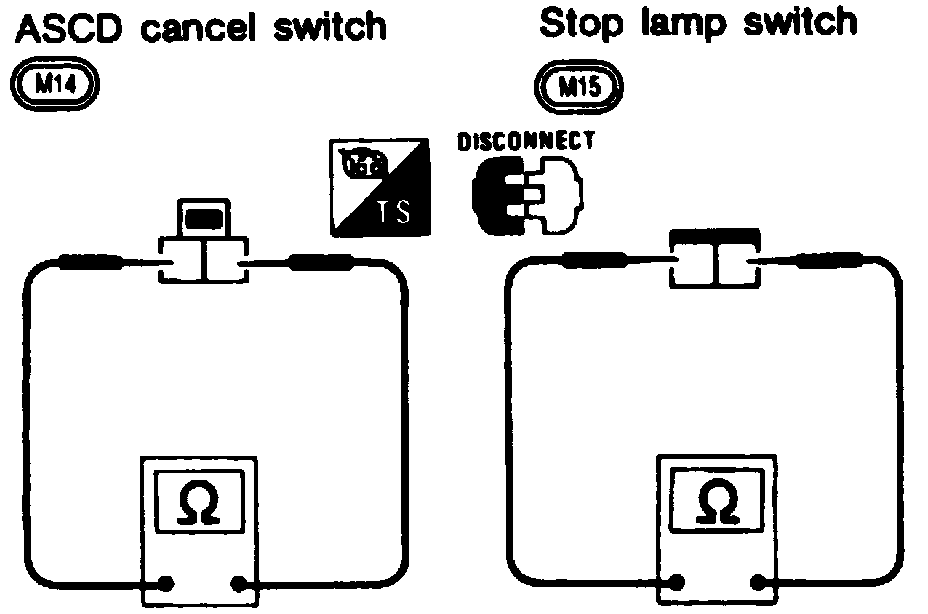 2. With brake pedal depressed, no continuity should exist at ASCD cancel switch. Release pedal, continuity should then exist.