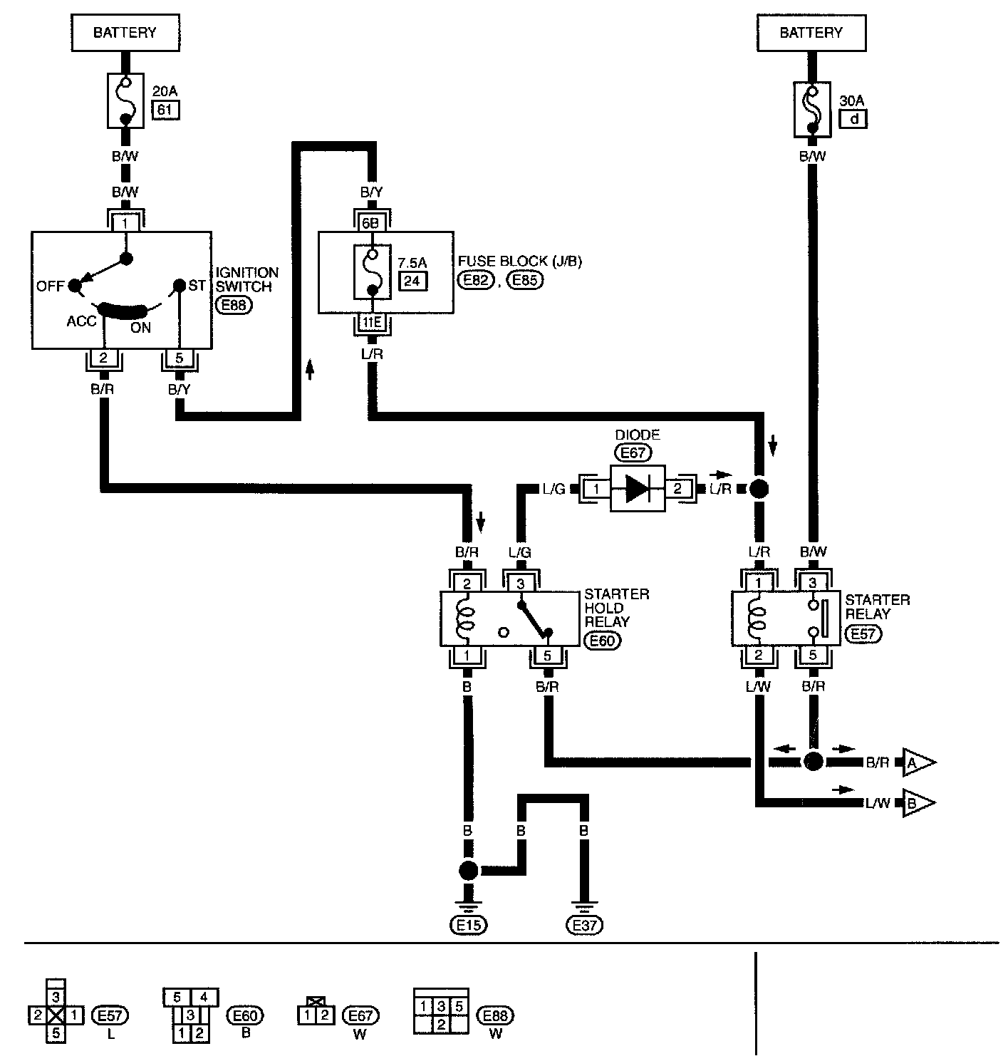 Diode No. 3 located between the starter relay and starter hold relay. Cathode to pin 1 of the starter relay and anode to pin 3 of the starter hold relay. wire color light blue/red stripe. Location, relay box, engine compartment right front fender.