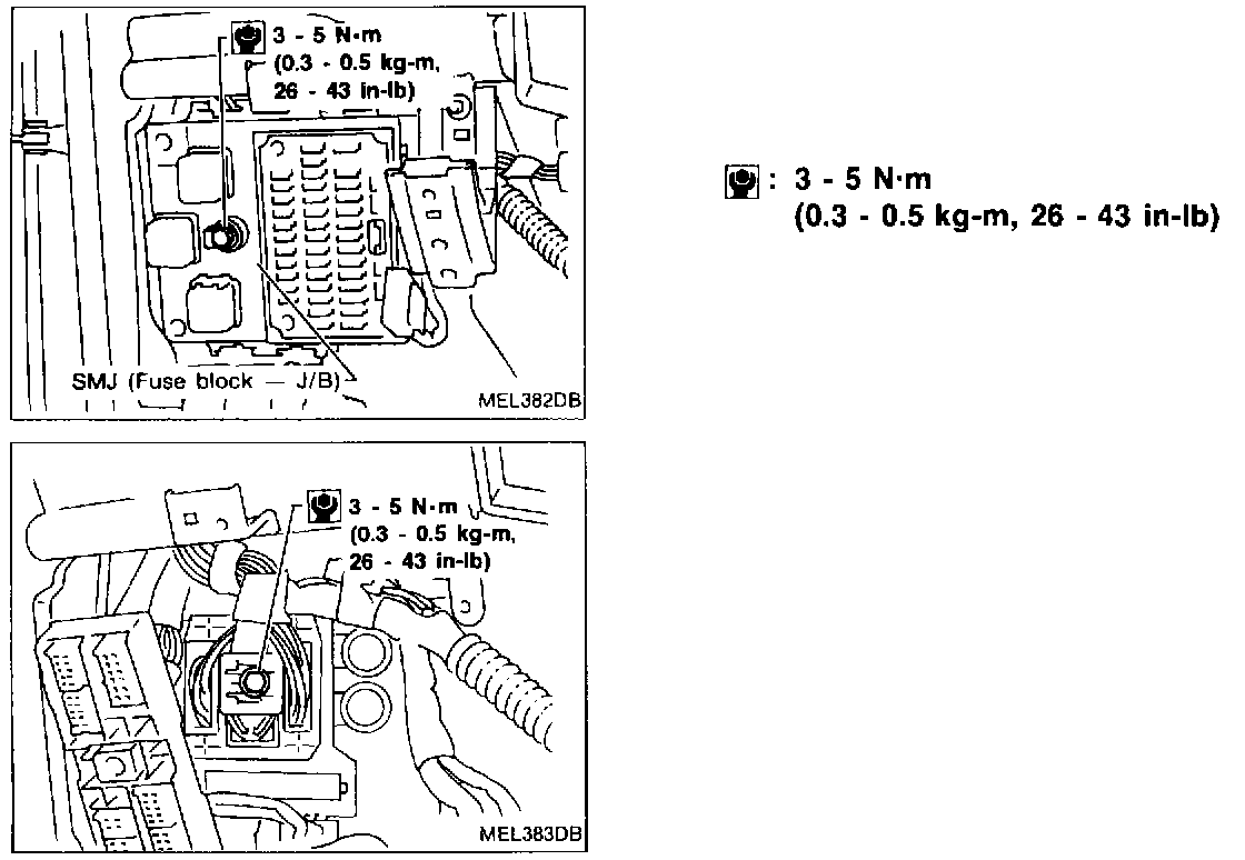 To install FUSE BLOCK (J/B) and Super Multiple Junction (SMJ), tighten bolts until orange "fulltight" ark appears and then retighten to specified torque as required.