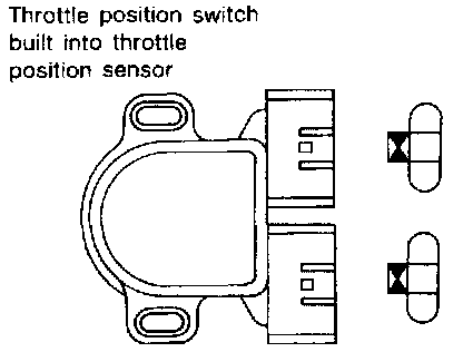 The throttle position switch, built into the throttle position sensor unit, consists of a closed throttle position switch and wide open throttle position switch. The closed throttle position switch detects the throttle valve position, i.e. whether it is in the idle position or not. The detected position will then be sent to the ECM as a voltage signal. The ECM uses this signal to open or close the EVAP canister purge control valve when the throttle position sensor is malfunctioning.
