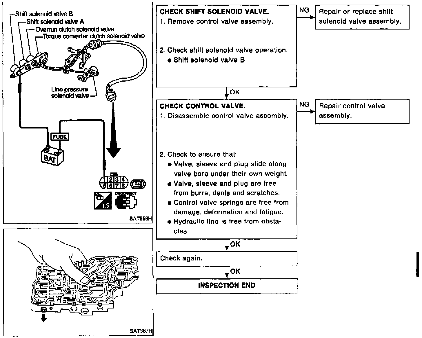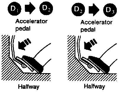 2) Start vehicle with selector lever in D and throttle opening halfway. Check that vehicle runs through gear shift of D1 -> D2 -> D3 -> D4, in accordance with shift schedule. Refer to shift schedule.