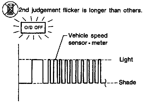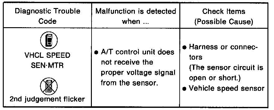 The vehicle speed sensor MTR is built into the speedometer assembly. The sensor functions as an auxiliary device to the revolution sensor when it is malfunctioning. The A/T control unit will then use a signal sent from the vehicle speed sensor MTR.