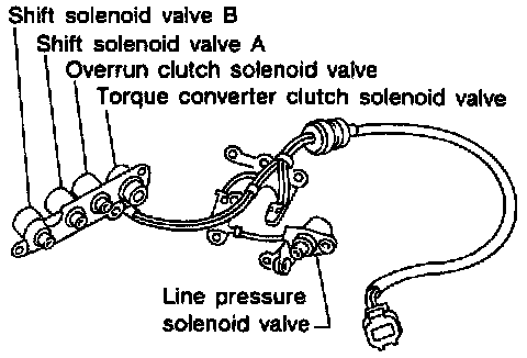 Shift solenoid valves A and B are turned ON or OFF by the A/T control unit in response to signals sent from the inhibitor switch, vehicle speed and throttle position sensors. Gears will then be shifted to the optimum position.
