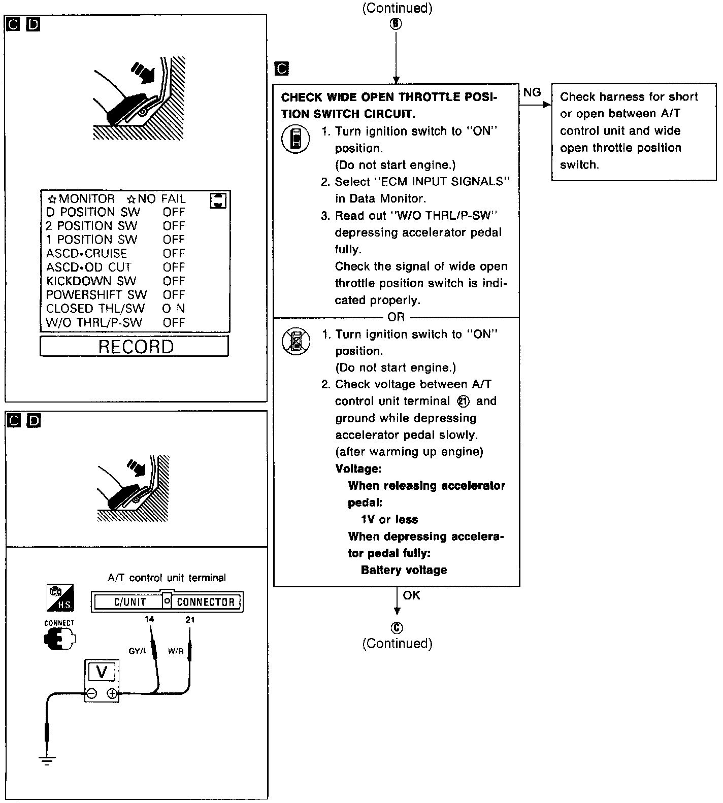 2) Drive vehicle under the following conditions: Selector lever in D, OD control switch in "OFF" position, vehicle speed higher than 10 km/h (6 MPH), throttle opening greater than 1/2 of the full throttle position and driving for more than 5 seconds.