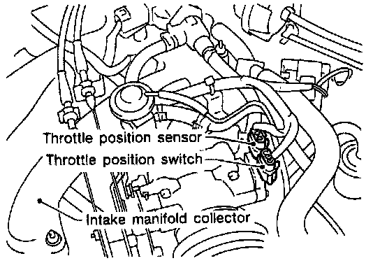 Consists of a wide-open throttle position switch and a closed throttle position switch. The wide-open position switch sends a signal to the A/T control unit when the throttle valve is open at least 1/2 of the full throttle position. The closed throttle position switch sends a signal to the A/T control unit when the throttle valve is fully closed.