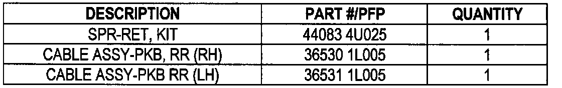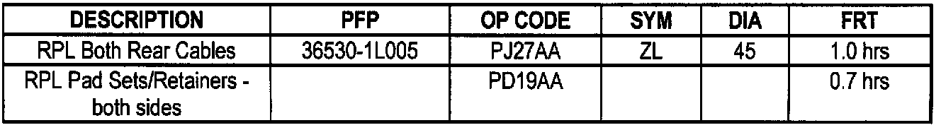 2. If the noise occurs as above, replace the parking brake cables and rear pad retainers with the parts listed in the Parts Information table.