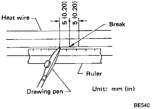 3. Place ruler on glass along broken line. Deposit conductive silver composition on break with drawing pen. Slightly overlap existing heat wire on both sides [preferably 5 mm (0.20 in)] of the break.