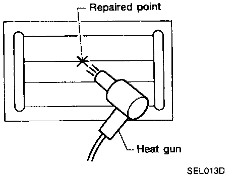5. Apply a constant stream of hot air directly to the repaired area for approximately 20 minutes with a heat gun. A minimum distance of 3 cm (1.2 in) should be kept between repaired area and hot air outlet. If a heat gun is not available, let the repaired area dry for 24 hours.