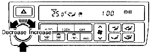 The PTC is built into the A/C control unit. It can be set at an interval of 0.5°C (1.0°F) in the 18°C (65°F) to 32°C (85°F) temperature range by rotating the temperature dial. The set temperature is digitally displayed.