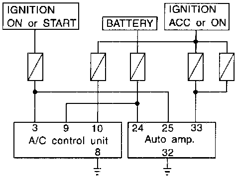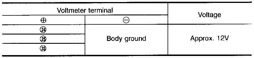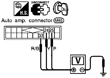 Check power supply circuit for auto amp. with ignition switch ON. Measure Voltage across terminal Nos.(24), (25), (33) and body ground.