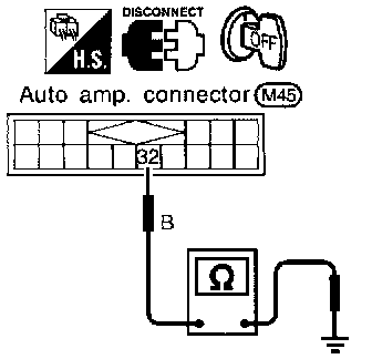 Check body ground circuit for auto amp. with ignition switch OFF. Check for continuity between terminal No.(32) and body ground.