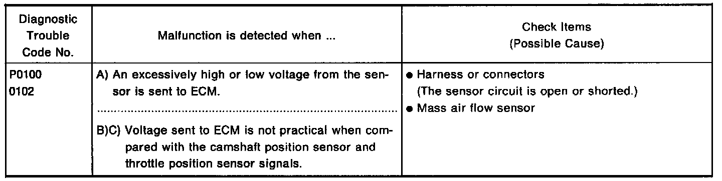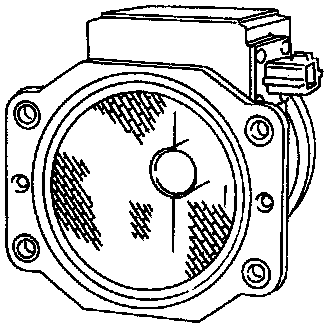 The mass air flow sensor is placed in the stream of intake air. It measures the intake flow rate by measuring a part of the entire intake flow. It consists of a hot film that is supplied with electric current from the ECM. The temperature of the hot film is controlled by the ECM a certain amount. The heat generated by the hot film is reduced as the intake air flows around it. The more air, the greater the heat loss.