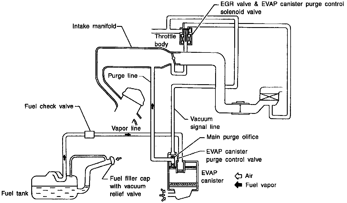 When the engine runs at idle, the EVAP canister purge control valve is closed. Only a small amount of vapor flows into the intake manifold through the constant purge orifice.