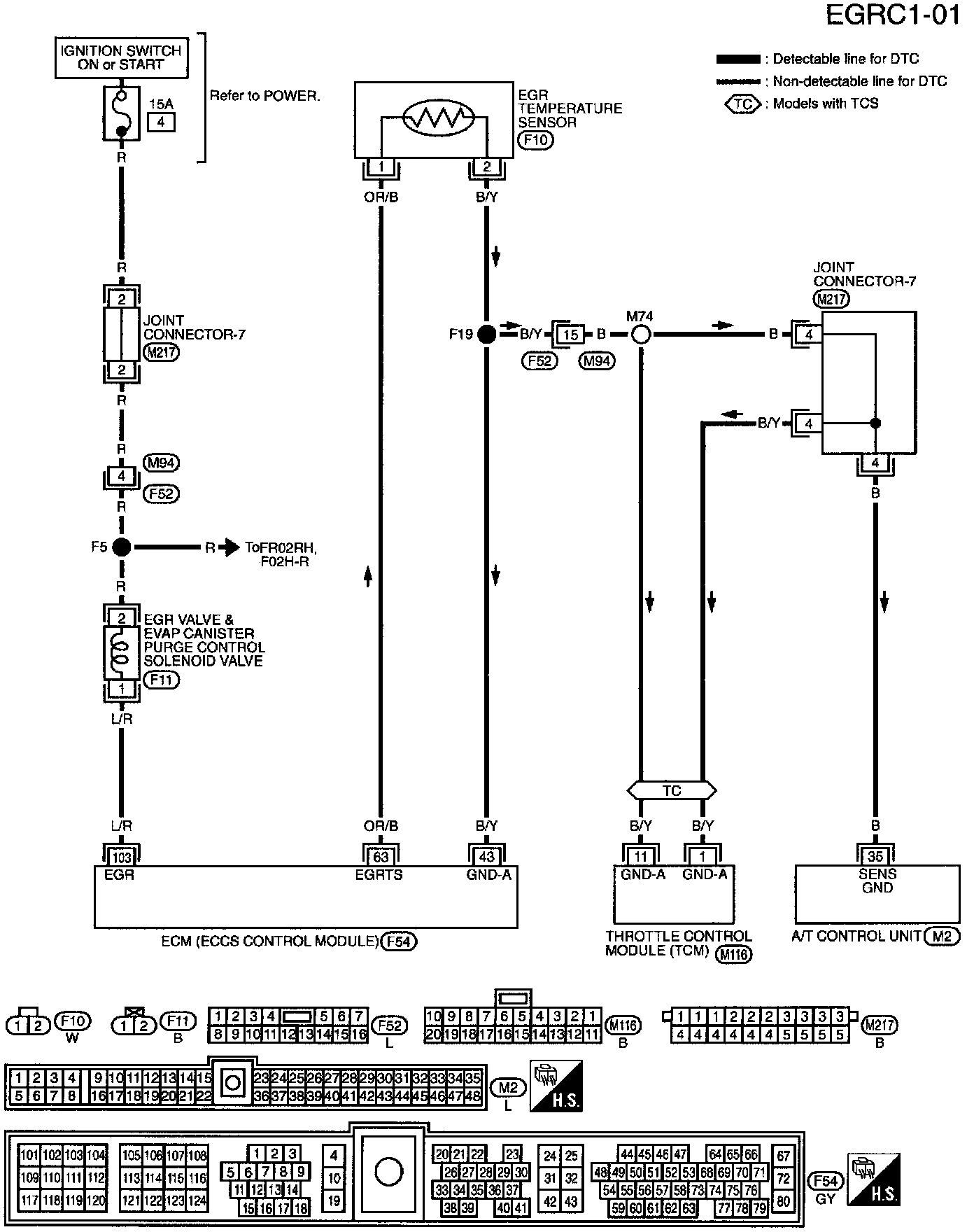 6) Check harness continuity between EGR temperature sensor harness connector terminal (2) and ECM terminal (43).