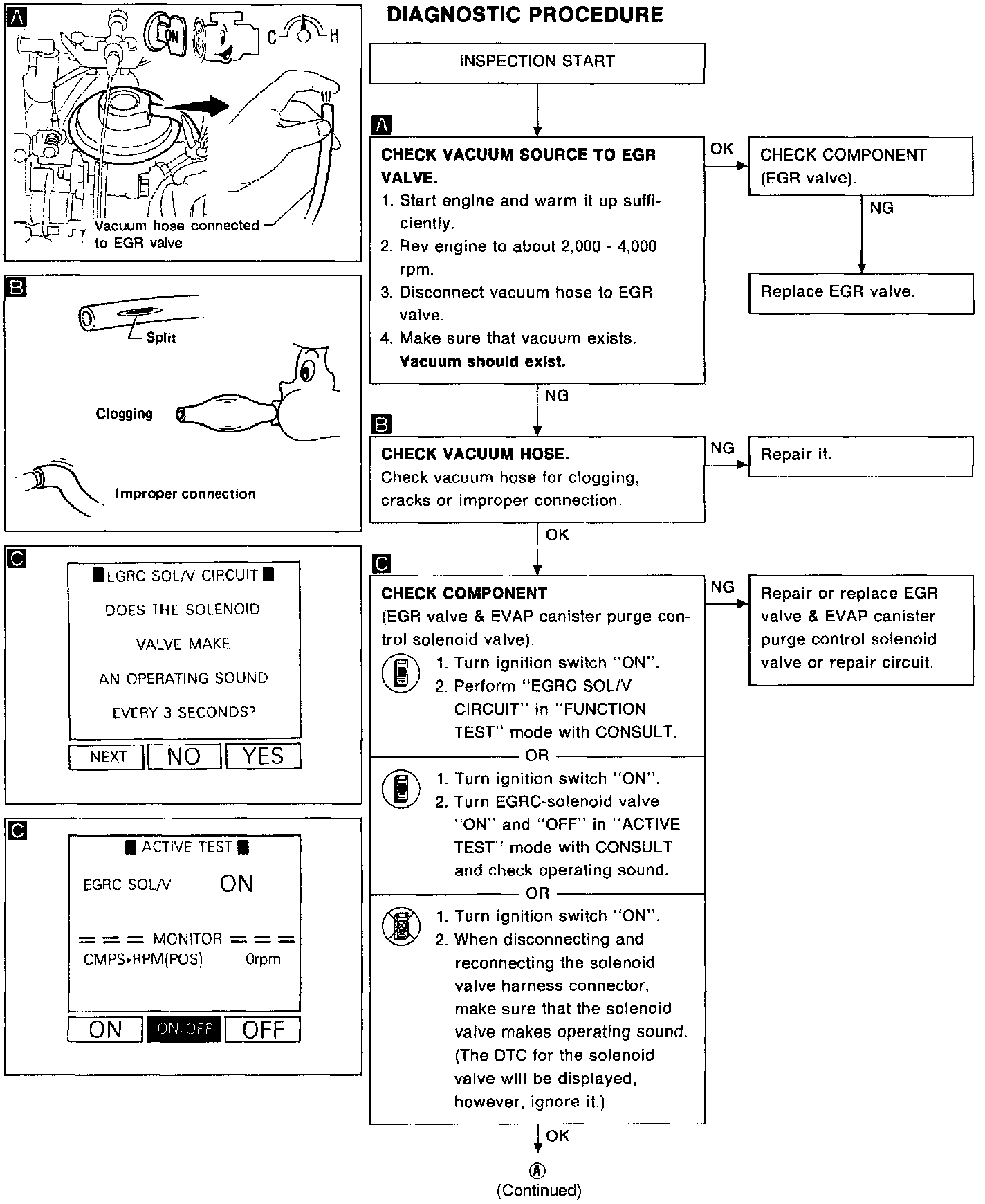 2) Select "EGRC SOLENOID VALVE" in "ACTIVE TEST" mode with CONSULT and turn the solenoid valve "OFF".