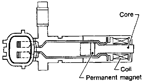 The sensor consists of a permanent magnet, core and coil. When the engine is running, the high and low parts of the teeth cause the gap with the sensor to change.